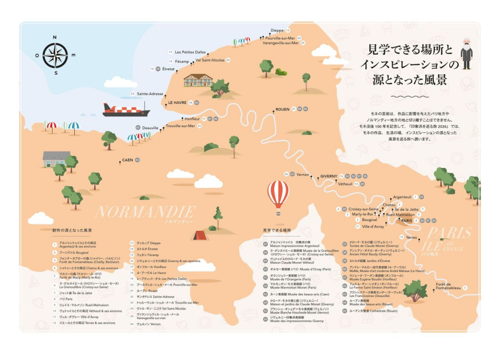 また、本プロジェクトでは「モネ流の『この一瞬』を楽しむ」として、鑑賞者が巨匠の私生活や創作の源泉に触れる体験型の旅を提唱している。世界最大のモネ・コレクションを誇るマルモッタン・モネ美術館や、代表作「睡蓮」が並ぶオランジュリー美術館といったパリの主要施設に加え、モネが晩年を過ごしたジヴェルニーの家や庭園を訪ねるルートが紹介されている。