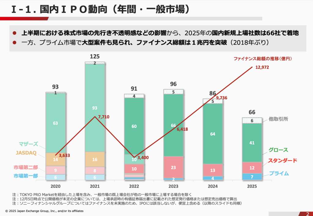 市場全体で見ると、2025年の国内新規株式公開(IPO)市場は、上場社数こそ伸び悩んだものの、大型案件の相次ぐ登場によって資金調達額が劇的に拡大する「質への転換」を象徴する一年となった。一般市場への新規上場社数は66社と前年の86社から減少した一方で、ファイナンス総額(公募・売出の合計)は前年比約33%増の約1兆2956億円に達し、2018年以来、7年ぶりに1兆円の大台を突破した。