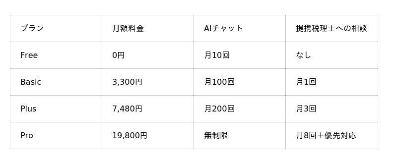 なお、FOXの提携税理士への相談はBasicプラン(月額3,300円)以上で利用可能です。無料プランでもAIチャット機能は月10回まで利用でき、外部税理士を登録すれば無料で相談できます。