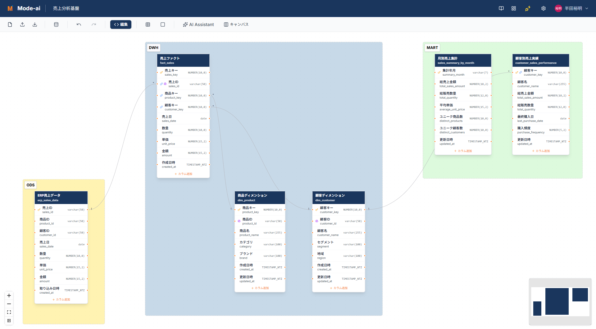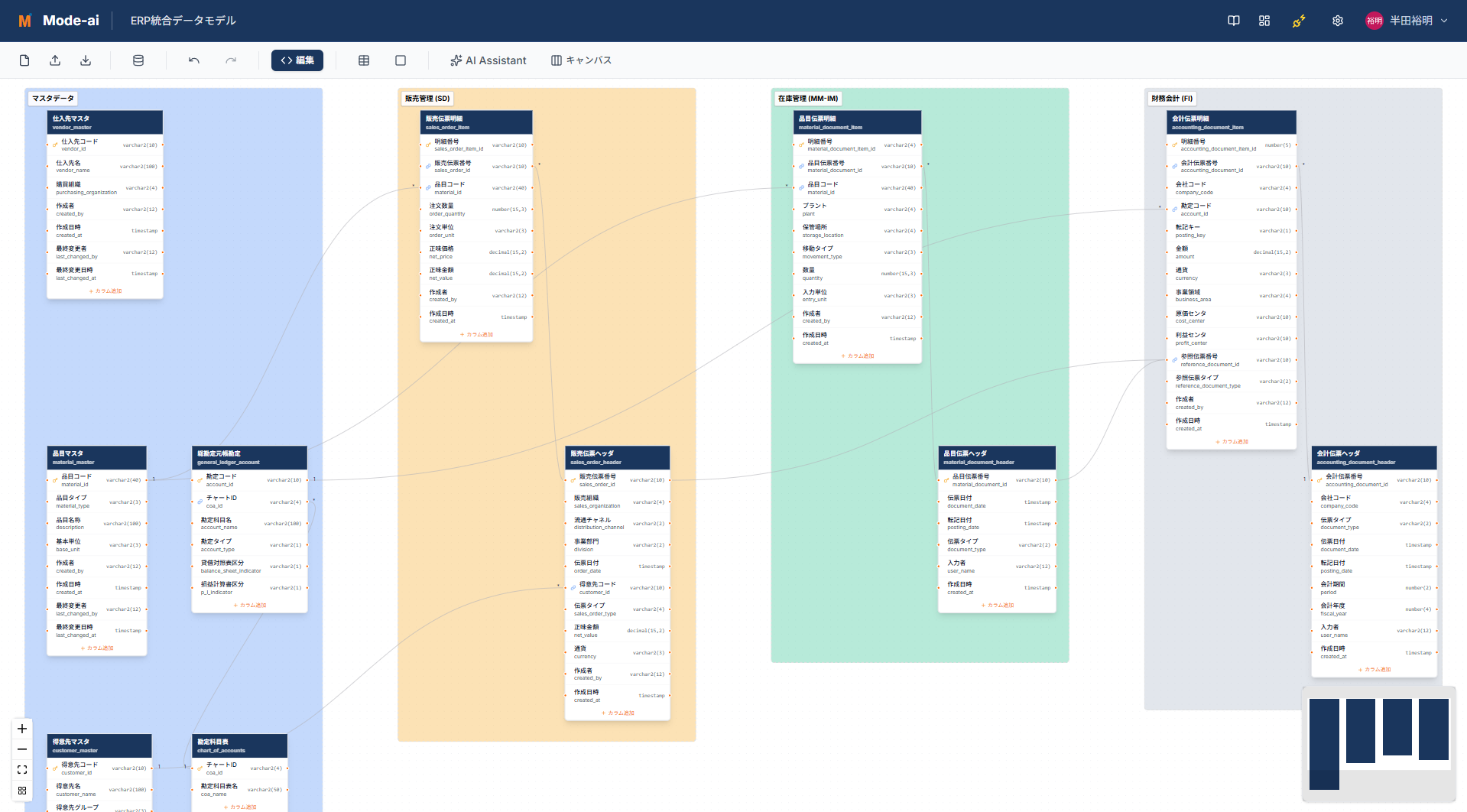 [画像3: https://prcdn.freetls.fastly.net/release_image/179487/2/179487-2-1398f01533bdf6f44b51a3de41a60f52-1919x1061.png?width=536&quality=85%2C75&format=jpeg&auto=webp&fit=bounds&bg-color=fff ]テーブル定義書インポート起点に自動モデリング2. AI駆動のデータモデル生成既存のExcelやCSV等のテーブル定義書をインポートするだけで、AIがデータ構造を解析。複雑な関連性を可視化します。