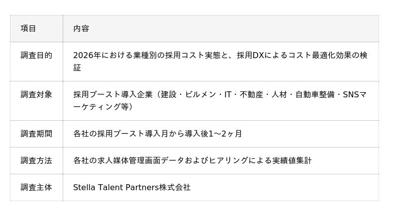2026年現在、採用コストは「単なる支出」から「戦略的投資」へと性質が変化しており、多くの企業がコストの可視化と最適化に注力しています。Stella Talent Partners株式会社が運営する採用支援サービス「採用ブースト」は、建設・ビルメン・不動産・IT業界を含む全国47都道府県の導入企業における採用コスト実態データを公開しました。
