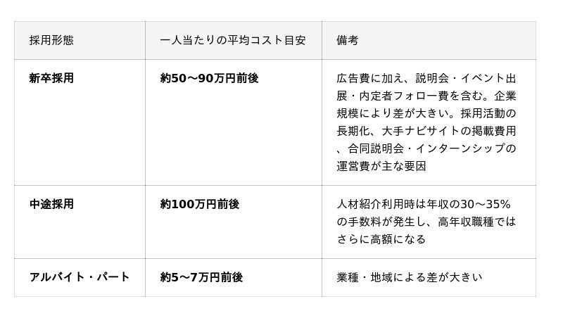 - 外部コスト: 求人媒体掲載費、人材紹介手数料、採用サイト制作費、イベント出展費、適性検査費など- 内部コスト: 人事担当者の人件費、面接官の工数(時間単価)、内定者フォローにかかる経費など