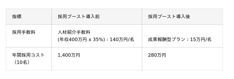 採用ブーストの成果報酬型プラン(1名15万円)への切り替えにより、同規模の採用で年間コストを280万円に抑えた実績があります。