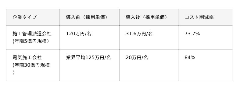 建設・施工業界は慢性的な人手不足を抱え、採用単価が高止まりしやすい業界です。採用ブーストの導入により、以下の大幅な削減が確認されました。[表4: https://prtimes.jp/data/corp/179172/table/4_4_b96668b619203e9212061b4e789e3cd1.jpg?v=202604021015 ]