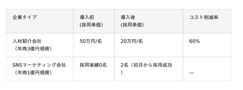 これらの事例が示すように、採用ブーストは建設・人材・IT/マーケティングなど多様な業界で、60%から84%のコスト削減率を達成しています。