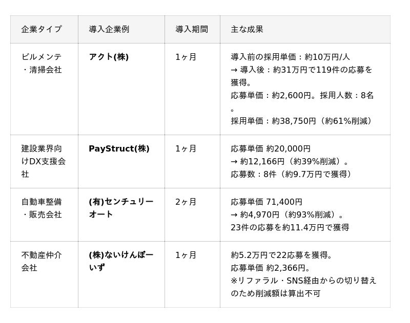 ビルメンテ・清掃会社では約31万円の予算で119件の応募と8名の採用を実現し、採用単価を約38,750円まで圧縮しました。自動車整備・販売会社では応募単価が71,400円から約4,970円へと93%削減され、約11.4万円で23件の応募を獲得しています。