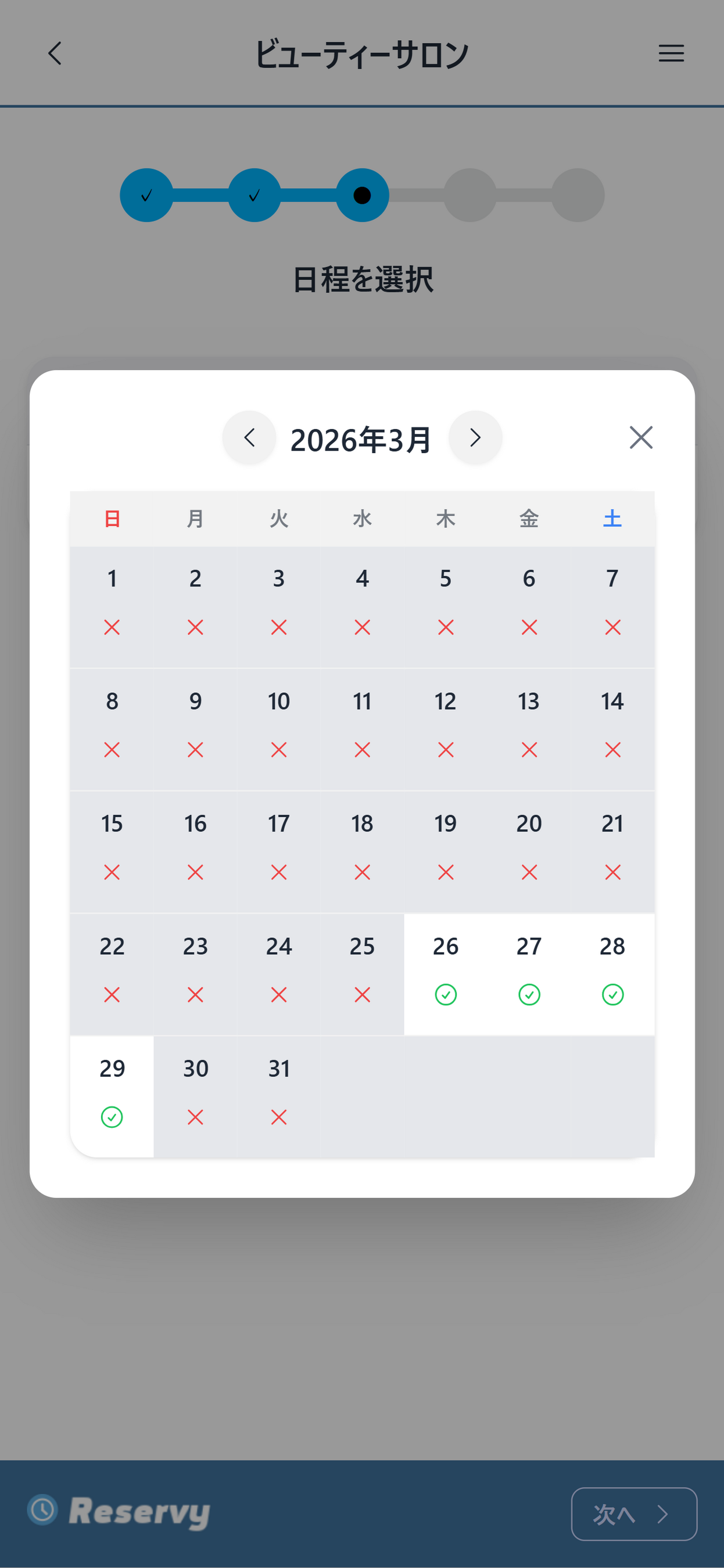 [画像5: https://prcdn.freetls.fastly.net/release_image/8563/5/8563-5-a71b218aa9f8f6ff6f3f76a53e1e72c7-1246x2700.png?width=536&quality=85%2C75&format=jpeg&auto=webp&fit=bounds&bg-color=fff ]日程を選択[画像6: https://prcdn.freetls.fastly.net/release_image/8563/5/8563-5-35bd333edc5dfc364efd789214f8436b-1246x2700.png?width=536&quality=85%2C75&format=jpeg&auto=webp&fit=bounds&bg-color=fff ]お客様情報を入力[画像7: https://prcdn.freetls.fastly.net/release_image/8563/5/8563-5-3d01420f527429afeff5ec9d260a9f0a-1246x2700.png?width=536&quality=85%2C75&format=jpeg&auto=webp&fit=bounds&bg-color=fff ]予約内容を確認