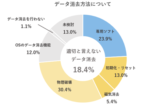 また、データ消去時における端末のデータ消去については、最も安全とされる「専用ソフトによるデータ消去」は23.9%(前回比11.4ポイント増)であったものの、依然として全体の4分の1未満にとどまりました。また、初期化や磁気消去といった適正と言えないデータ消去方法は前回比4.6ポイント減となり、改善は見られるものの、いまだ約2割が実施している状況です。