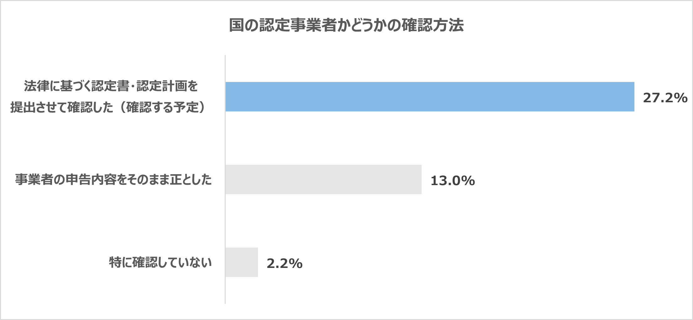さらに、委託事業者の確認の際、法律に基づく認定書・認定計画を提出させている自治体は27.2%。さらに、約18%が事業者の実績申告をそのまま信用していたことが判明