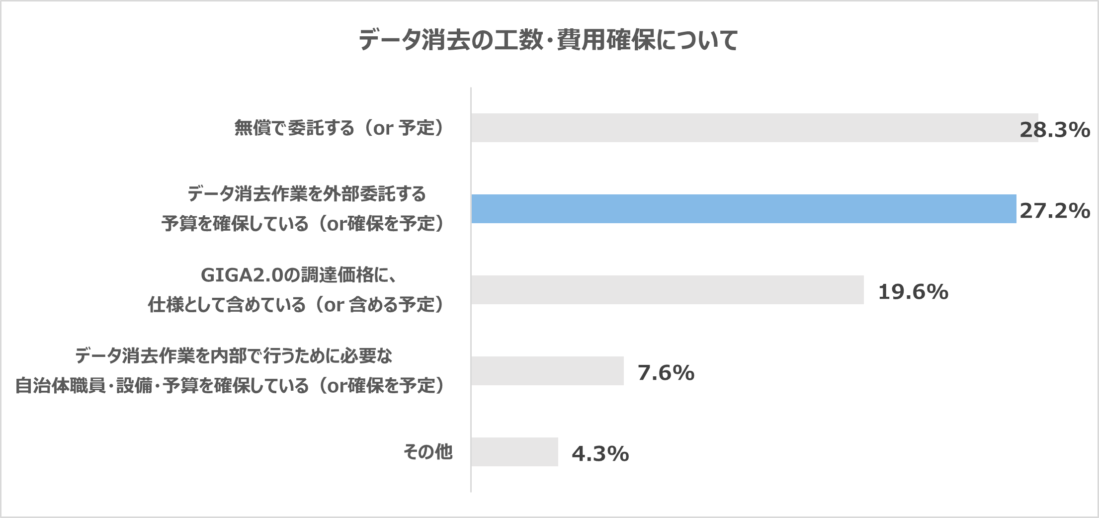 GIGAスクール端末の処分やデータ消去のための予算を確保できている教育委員会は27.2%と、半年前(28.8%)からほぼ横ばいで、データ消去を内部で行うために予算確保している(予定している)と合わせて34.8%。前回調査同様、約3分の1程度にとどまりました。適切な処分・データ消去ができない理由として「予算が確保できない」と回答した自治体も約1割存在します。外部委託を進めるには自治体内の予算措置に加え、国による支援を含め令和8年度、9年度予算での十分な財源確保が求められます。