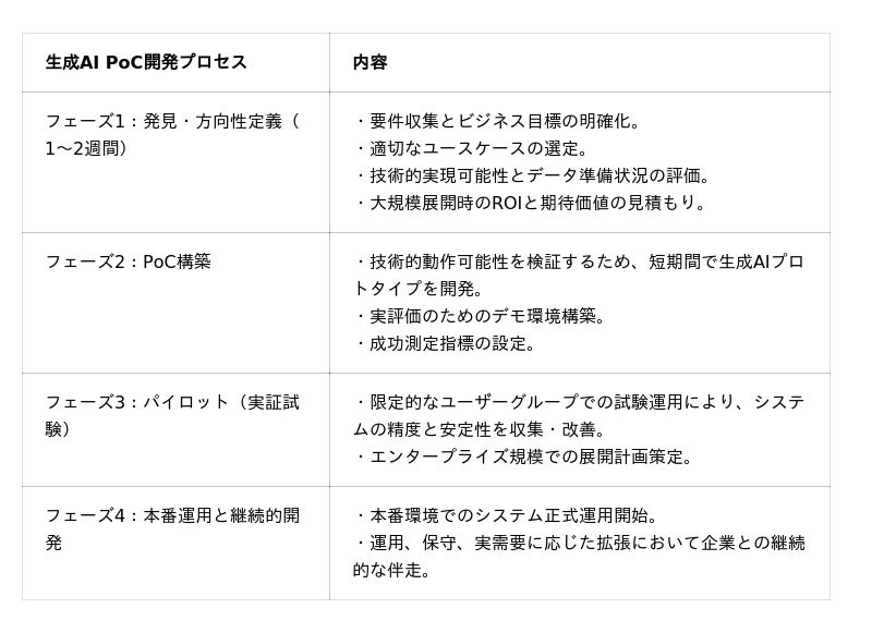 お客様が安心して企業内に生成AIを導入できるよう、アイデアから本番運用まで4つのフェーズでロードマップを構築しています。[表1: https://prtimes.jp/data/corp/139490/table/20_1_d2228805348d331c2cac5f026c47460e.jpg?v=202602110645 ]