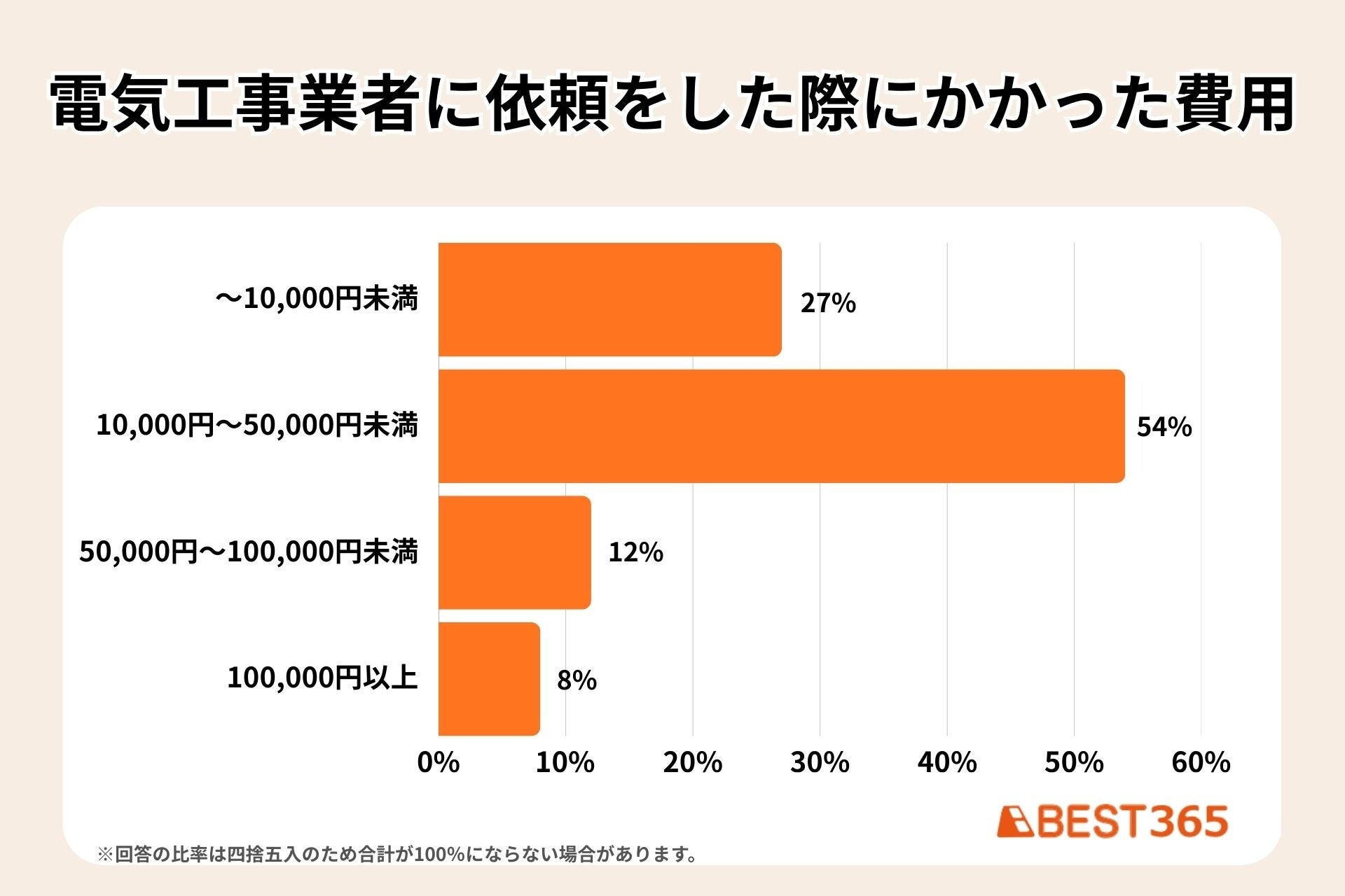以下は、今回のアンケートで、電気工事業者に依頼した際にかかった費用を集計した結果です。
