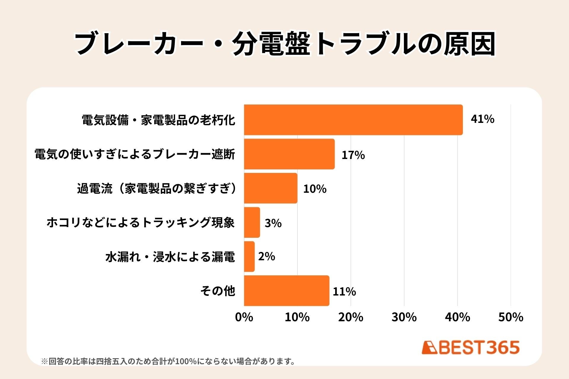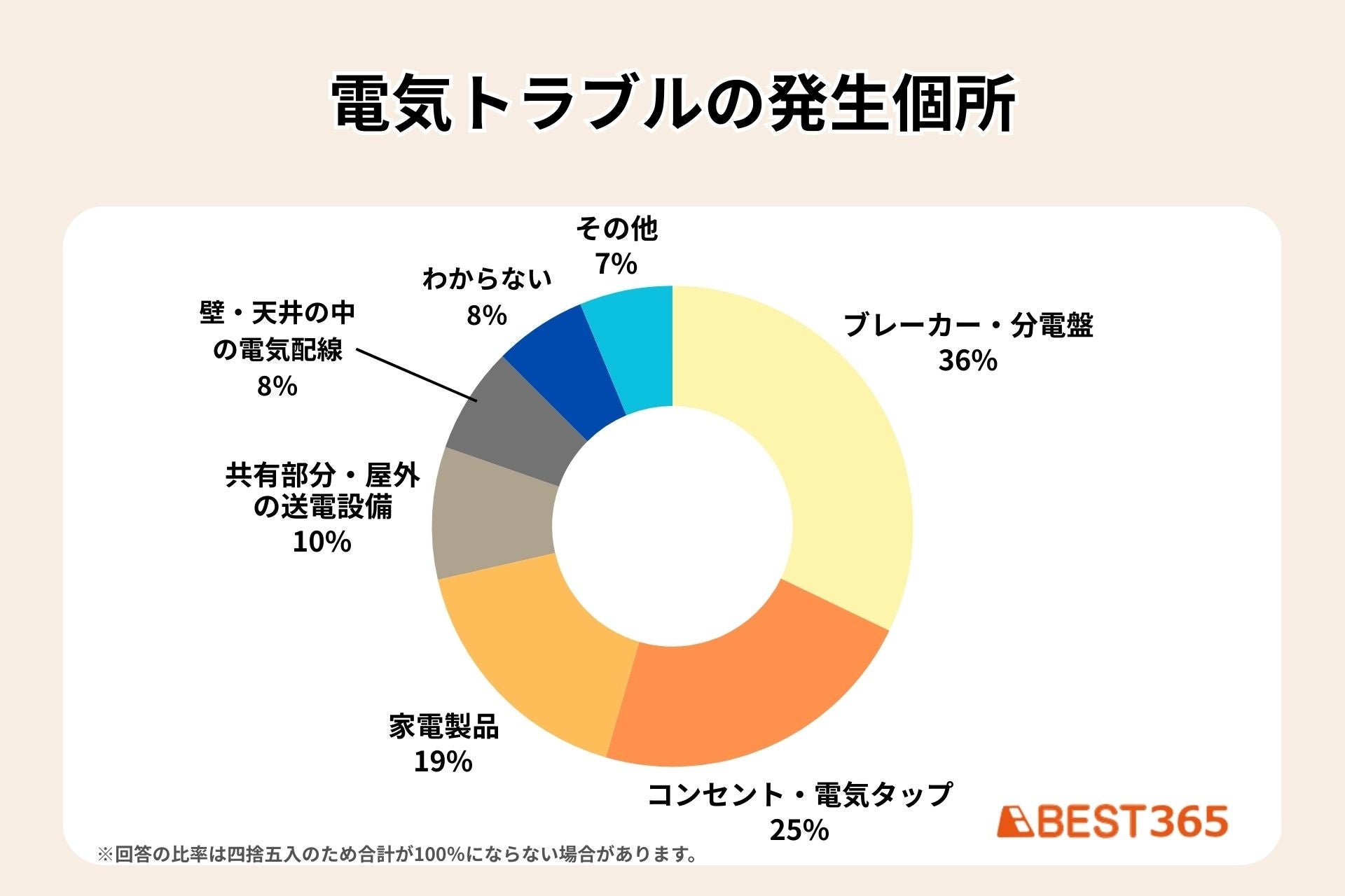 BEST365では、電気トラブルが一番多い夏に先立ち、過去に電気関連のトラブルに実際に遭われた男女100人にアンケートを実施しました。電気トラブルは感電、火災等の重大な事故となることがあるため、どのような箇所でどのような原因で起こるのか傾向を踏まえ、電気消費量が増える夏前に電気機器周りの総点検を行うことを提案します。