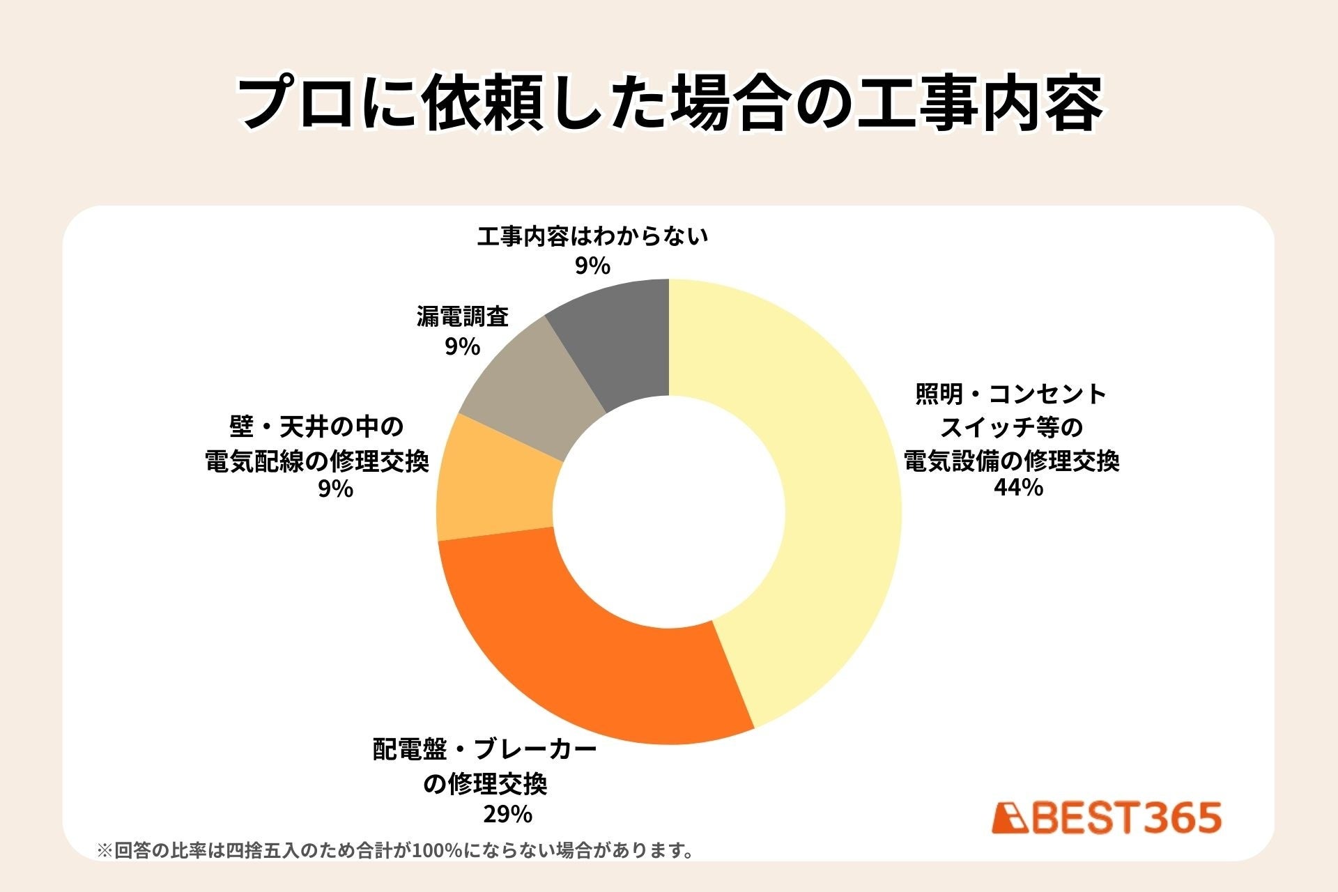 電気工事業者に依頼した場合にどのような工事が行われたのか、アンケートを集計したところ、一位は「照明・コンセント・スイッチ等の電気設備の修理交換」で44%、二位は「配電盤・ブレーカーの修理交換」で29%という結果でした。