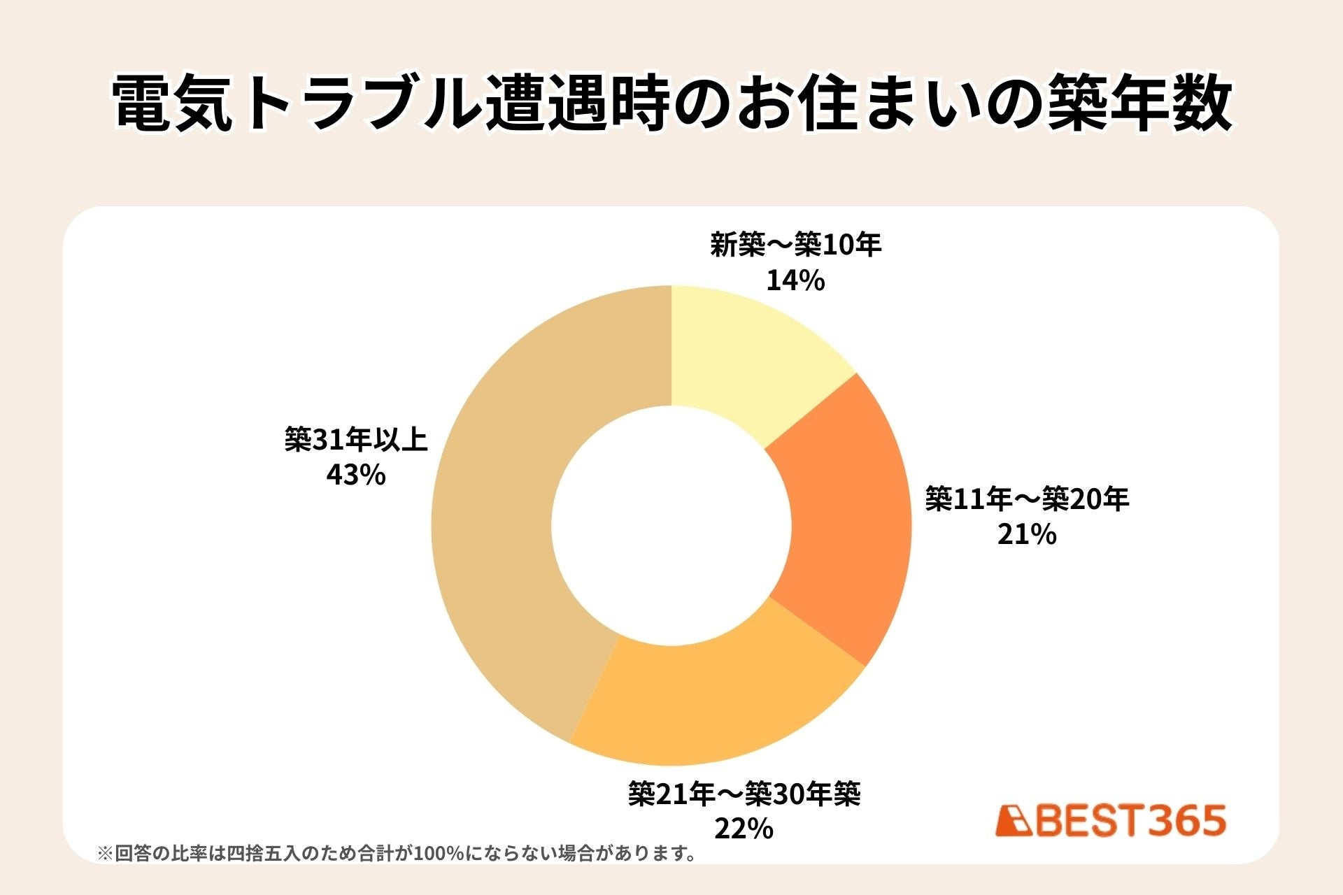 電気トラブルに遭われた方のお住まいの築年数を集計した結果、当初想定していたとおり、築年数が経過するほどに、発生する可能性が高くなることがわかりました。