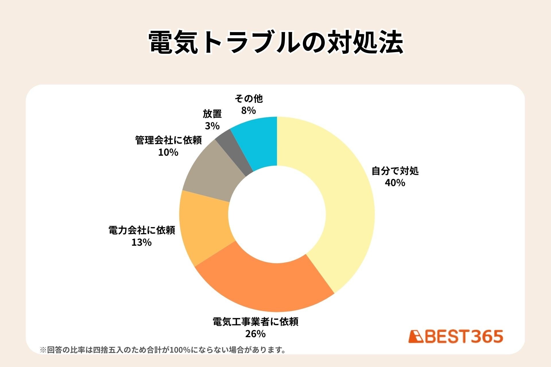 電気トラブル時の対処方法は、アンケートでは「自分で対処」が一位、次点で「電気工事業者に依頼」でした。