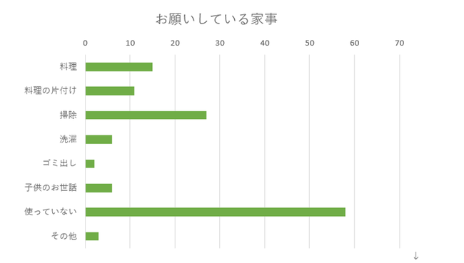 依頼している家事の種類で多かったのは「掃除」になります。ルンバやブラーバといったお掃除ロボットが主流となってきているとはいえ、お風呂、おトイレ、台所、リビング、寝室と、家の中はどんどん散らかっていきますし、仕事や子育てが終わると体力がもうなくなり、ヘトヘトになって動くのもやっとですから、掃除を人にしてもらうのはいいのではないでしょうか。