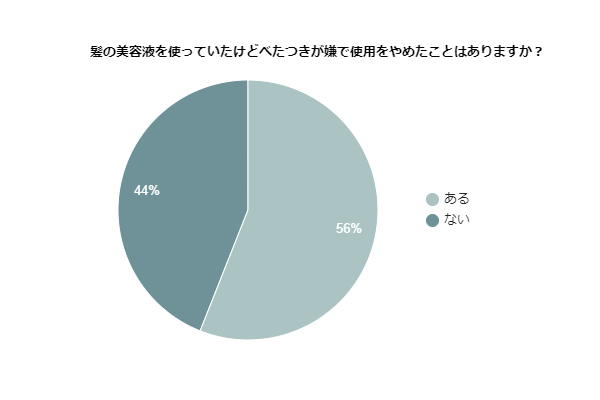約半数の56%の人が「ある」と回答したのです。美容液は、朝のスタイリング時や寝る前に付けることがおおいので、その後の過ごし方に影響があるほどべたつくのはあまり好まれません。