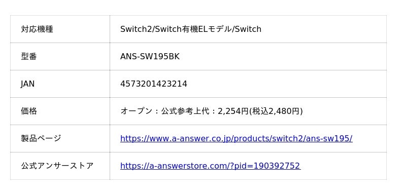 本製品は、アンサー株式会社のオリジナル製品であり、任天堂株式会社のライセンス製品ではありません。「Switch」「Switch2」「Switch Lite」「ドック」は任天堂株式会社の登録商標です。その他の会社名、商品名は各社の商標、又は登録商標です。