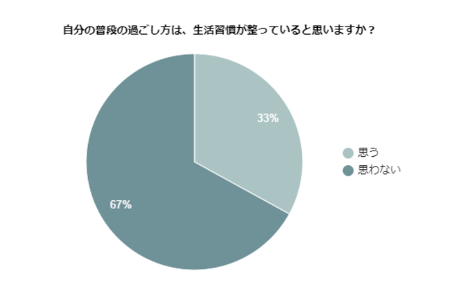 しかし、「自分の普段の過ごし方は生活習慣が整っていると思いますか?」と聞くと約3割まで数字が下がりました。自分の思うように生活できていない人が一定数いるということです。