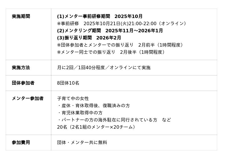 [画像2: https://prcdn.freetls.fastly.net/release_image/11350/41/11350-41-b80eec8e60a2edd26fddde11f32374d6-1008x428.png?width=536&quality=85%2C75&format=jpeg&auto=webp&fit=bounds&bg-color=fff ]NPOメンタリングプログラムの仕組み
