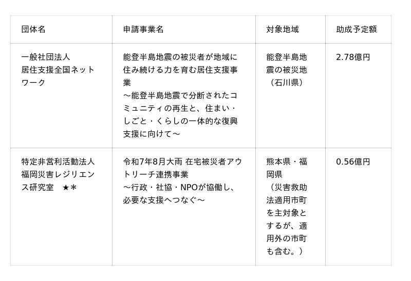 決定した資金分配団体名とその事業名、事業対象地域は表の通りです。