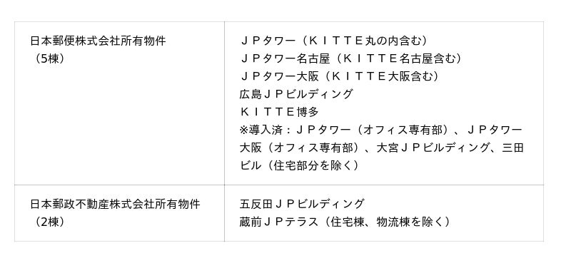 日本郵政グループは、2050年のカーボンニュートラル達成に向けて、2030年度までに温室効果ガス排出量を2019年度比で46%削減することを目指しています。本取り組みは、日本郵政グループの使命および社会的責任を踏まえた環境負荷低減策の一環として実施するものです。また、対象物件では共用部だけでなく専有部も含めた全館を対象に、各物件でRE100(※2)対応プランを導入します。これにより、入居テナントのRE100達成にも貢献いたします。