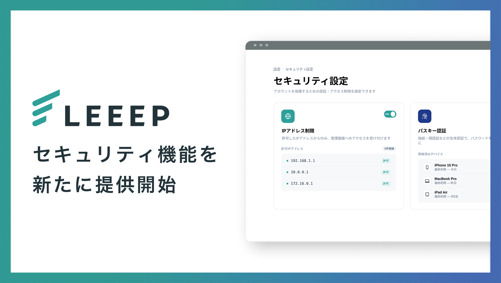 LEEEP、パスキー認証とIPアドレス制限に対応。多層防御で管理画面のセキュリティを強化