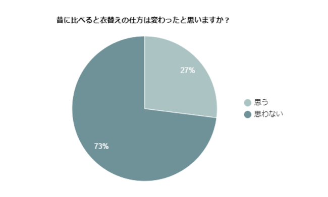 さらに、「昔に比べると衣替えの仕方は変わったと思いますか?」というアンケートも行いました。すると、「思わない」と答えた人は73%と多かったのですが、「思う」と答えた人も27%と一定数いたのです。