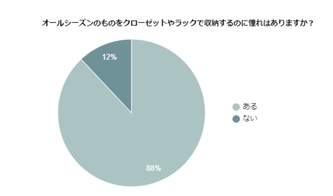 これは、綺和美が「オールシーズンのものをクローゼットやラックで収納することに憧れはありますか?」と聞いた結果です。88%もの人が「ある」と答えました。