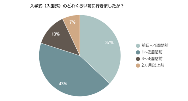 一番多かった回答は、「1~2週間前」で43%と半数近くの数字です。次に多かったのは、「前日~1週間前」でした。この結果からわかるように、約8割の人は入学式(入園式)に近くなってから美容院に行っているということがわかります。