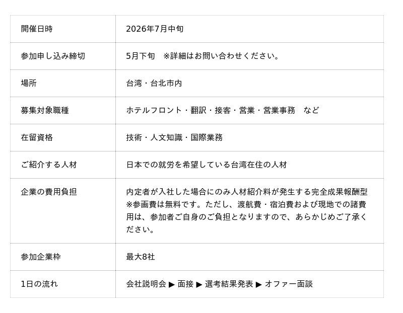 株式会社マイナビグローバル(本社:東京都千代田区、代表取締役 社長執行役員:杠元樹、マイナビグループ)は2026年7月に台湾・台北市にて、日本での就労を希望する台湾人材と直接面接できる複数社合同の面接会「九州沖縄×台湾キャリアコネクト」を開催します。今まで熊本県企業に限定していた本イベントを、今回は九州・沖縄県内の企業に拡大して実施します。