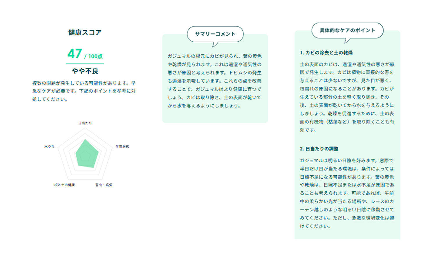 「水やりの頻度を◯日に1回に調整してみましょう」「置き場所を◯◯に変更してみましょう」など、すぐに実践できる具体的なケア方法をアドバイスします。