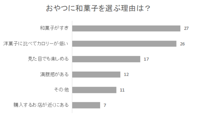 すると、一番多かった回答は「和菓子がすき」で27人という結果です。ほぼ同じ回答数で、「洋菓子に比べてカロリーが低い」も26人です。