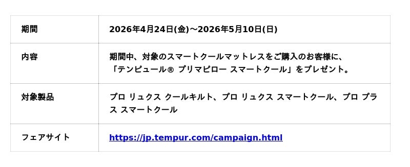 テンピュール・シーリー・ジャパン(本社:兵庫県神戸市)は、余分な熱を逃がし、深部体温のコントロールをサポートするマットレス「テンピュール(R) スマートクール」の新製品発売に際し、「テンピュール(R) スマートクールマットレス発売記念キャンペーン」を2026年4月24日(金)から開催します。期間中に対象のマットレスをご購入のお客様に、「テンピュール(R) プリマピロー スマートクール」を数量限定でプレゼントいたします。