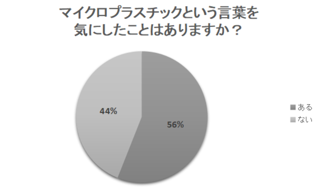 その証拠に、「マイクロプラスチックという言葉を気にしたことはありますか?」というアンケートを行ったところ、56%の人が「ある」と回答しました。日本では、まだ半数を少し超える人しか意識していないという結果です。