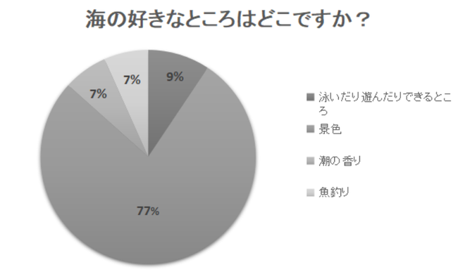 先ほどのアンケートで「海が好き」と答えた人に、「海の好きなところはどこですか?」というアンケートも行ってみました。結果は下記の図の通りです。