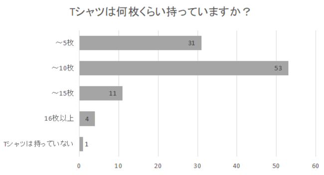 次に多かったのは、「1~5枚」で31人という結果です。多くの人の、Tシャツの所持数の平均は10枚以下ということがわかりました。