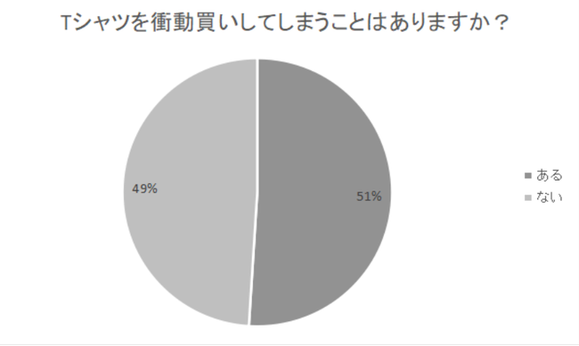 一人あたり10枚以下の所持数が平均ということがわかりました。Tシャツは洋服の中でも手に入れやすいアイテムです。そこで、それらのTシャツを購入する際、衝動買いをしてしまうことがあるのかどうかも聞いてみました。結果は、51%の人が「ある」と回答したのです。