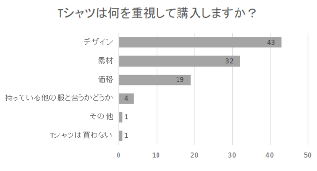 衝動買いをする人の割合は半数ということがわかりました。そこで、Tシャツを購入する際にどのようなことを重視しているのかを聞いてみました。