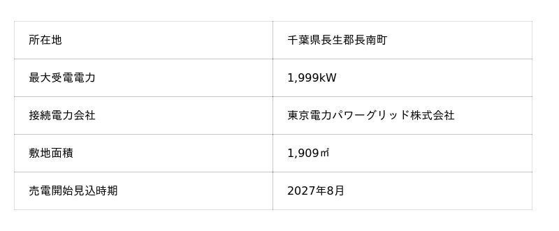 千葉エリアは、太陽光発電所が多い事に加え、将来的にデータセンターの集約が予測され、電力需要が高まる中で本案件は電力安定化に寄与できるものと考えております。
