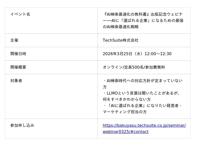 また、書籍の出版を記念して、2026年3月25日(水)にAI検索時代のマーケティング戦略をテーマとした無料ウェビナー「AIに選ばれる企業になるための最強のAI検索最適化戦略」をオンラインで開催いたします。