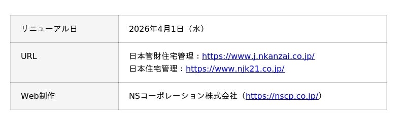 日本管財ホールディングス株式会社(本社:東京都中央区、代表取締役社長:福田慎太郎、以下「当社」)は、当社のグループ会社である日本管財住宅管理株式会社および日本住宅管理株式会社が、2026年4月1日(水)にコーポレートサイトを全面リニューアルしたことをお知らせいたします。