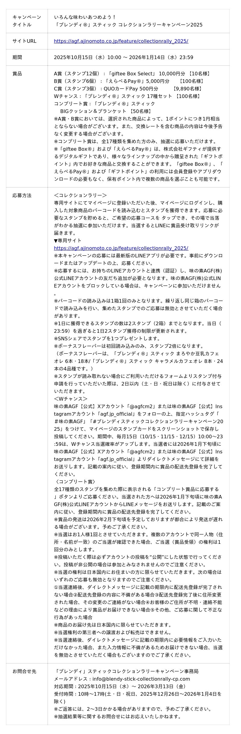 【「ブレンディ(R)」スティック コレクションラリーキャンペーン2025 実施概要】