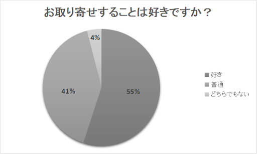 綺和美では、「お取り寄せすることは好きですか?」というアンケートを行いました。すると、半数以上の55%の人が「好き」と答えたのです。