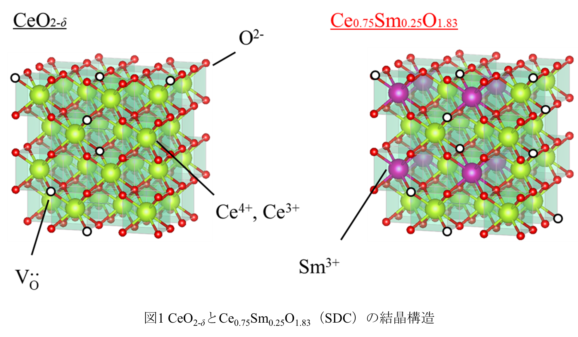 固体電解質として酸化物イオン伝導性セラミックスを用いたSOFCは、700℃以上の高温で動作し、理論上50%を超える高い発電効率が得られます。代表的な電解質材料としては、イットリア安定化ジルコニア(YSZ)や蛍石型構造の酸化セリウム(IV)(CeO2)などがあり、いずれも高い安定性と酸化物イオン伝導性を示すことが知られています。一方で、これらの材料における酸化物イオン伝導は、結晶中に存在する酸素空孔の位置と濃度に強く依存することが、計算科学の側面から明らかになっています。これは、酸化物イオンが結晶格子内の酸素空孔と隣接サイトの間をホッピングして移動することに起因しています。