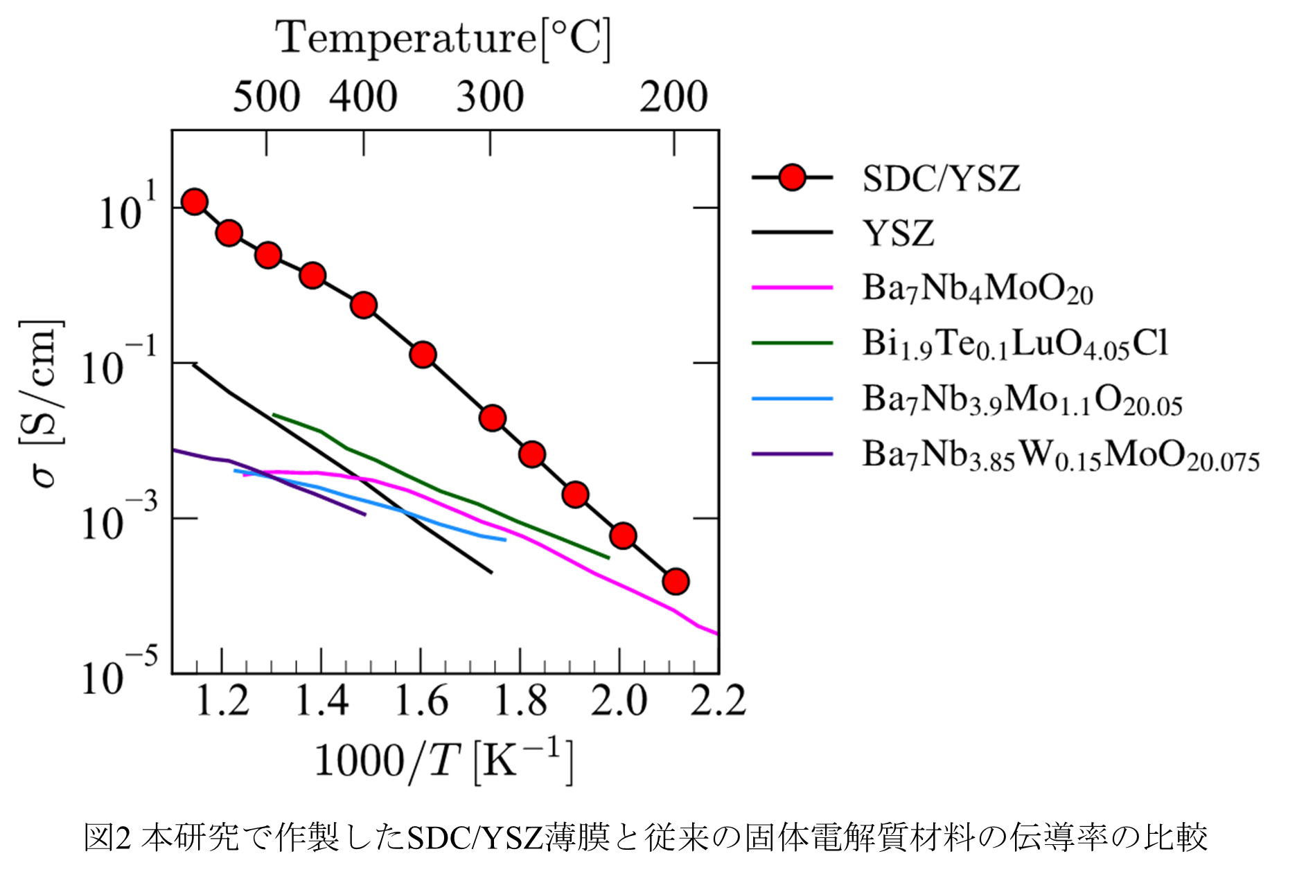 (100)配向イットリア安定化ジルコニア(YSZ)基板上に成膜したa軸配向Sm3+ドープCeO2(SDC)薄膜が、200 ~ 550℃の中温域で動作し、極めて高い酸化物イオン伝導率(σ > 10-2 S/cm)を示すことを明らかにしました。