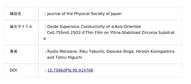 東京理科大学 先進工学部 物理工学科の樋口 透教授、同大学大学院 先進工学研究科 物理工学専攻の森實 亮太氏(2025年度 修士課程2年)、田淵 理久氏(2025年度 修士課程2年)、東北大学多元物質科学研究所の志賀 大亮助教、組頭 広志教授らの共同研究グループは、200 ~ 550℃の中温域で動作する固体酸化物燃料電池(SOFC)の新規電解質材料として、a軸配向 Sm3+ドープCeO2(Ce0.75Sm0.25O2-δ: SDC)薄膜を作製し、世界最高水準の酸化物イオン伝導度を実現しました。