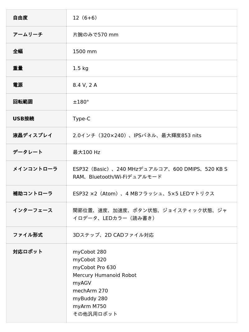 myCobot 280(M5 / Pi)、myCobot 320(M5 / Pi)、myAGV(Pi / Jetson)、mechArm 270(M5 / Pi)、myArm M750、Mercury A1、Mercury B1等で使用でき、本製品と連携した開発やデータ収集、遠隔操作が可能です。