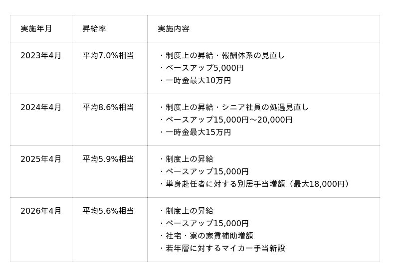 また、多様な地域での経験を積むことによる社員の成長や活躍を支援する為に、若年層を対象としたマイカー手当を新設するとともに、近年の物価上昇に伴う家賃相場の上昇を踏まえ、社宅・寮の家賃補助増額を実施します。これらの施策を含めた全社平均の昇給率は5.6%となります。